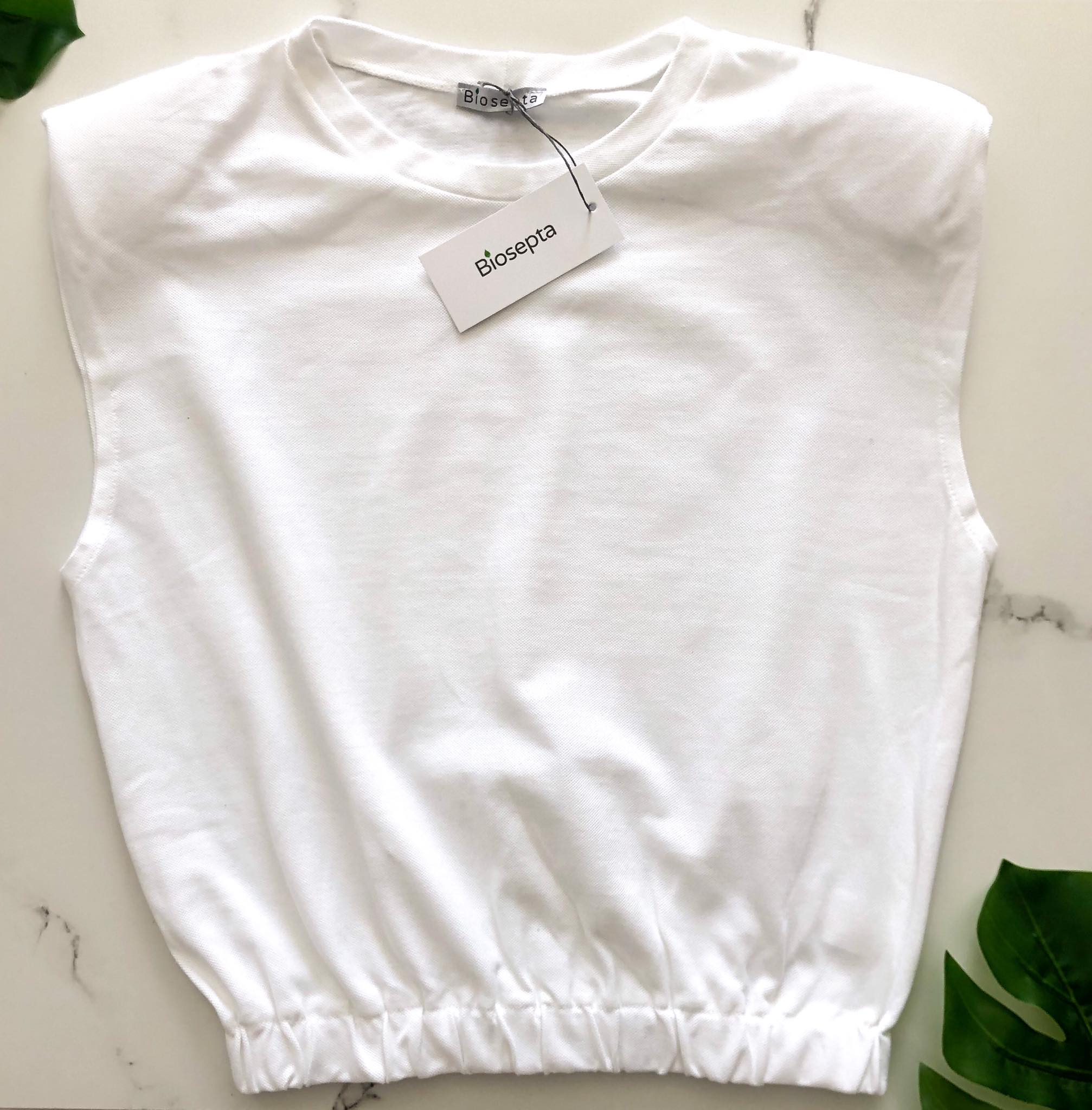 Λευκό top αμάνικο πικέ με βάτες και λάστιχο στη μέση. Ένα top που συνδυάζεται με τα πάντα. Δροσερό και απαλό. Με στρογγυλή λαιμόκοψη. 100% βαμβάκι.